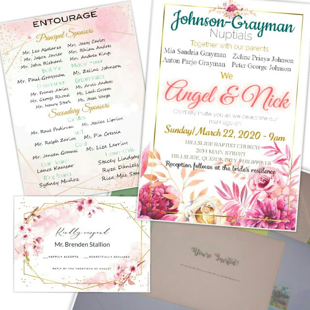 What Are The Parts Of A Filipino Wedding Invitation Nuptials Ph from www.nuptials.ph Invitation entourage sample bridal template sponsors templates layout unique canva result postermywall customize. Simply follow the directions and you'll have a personalized wedding invite ready for printing. Ask your wedding invitation designer to create a separate sheet for the entourage list, to be included in the invitation suite. You may also order any of our invitations in quantities as low as 10 so you can customize with your own information, colors and photos and see them up close and personal before you make. Your wedding invitation wording and invitation design clue your guests into details like your wedding's formality, color scheme, and overall tone. One thing is for sure, though: Customize this invitation with your own colors, fonts, and wording to suite your event. 2 parts of a wedding invitation: